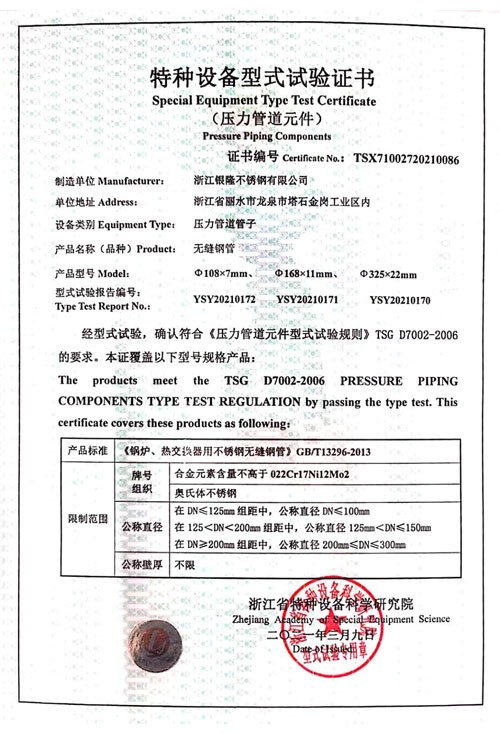 浙江銀隆不銹鋼有限公司創始于2006年,是一家專業生產不銹鋼無縫管的企業。公司位于浙江麗水市,企業注冊總資金貳億壹仟柒佰肆拾玖萬元,擁有4家工廠,占地總面積11萬平方米,職工530人,年產不銹鋼無縫管5萬噸。